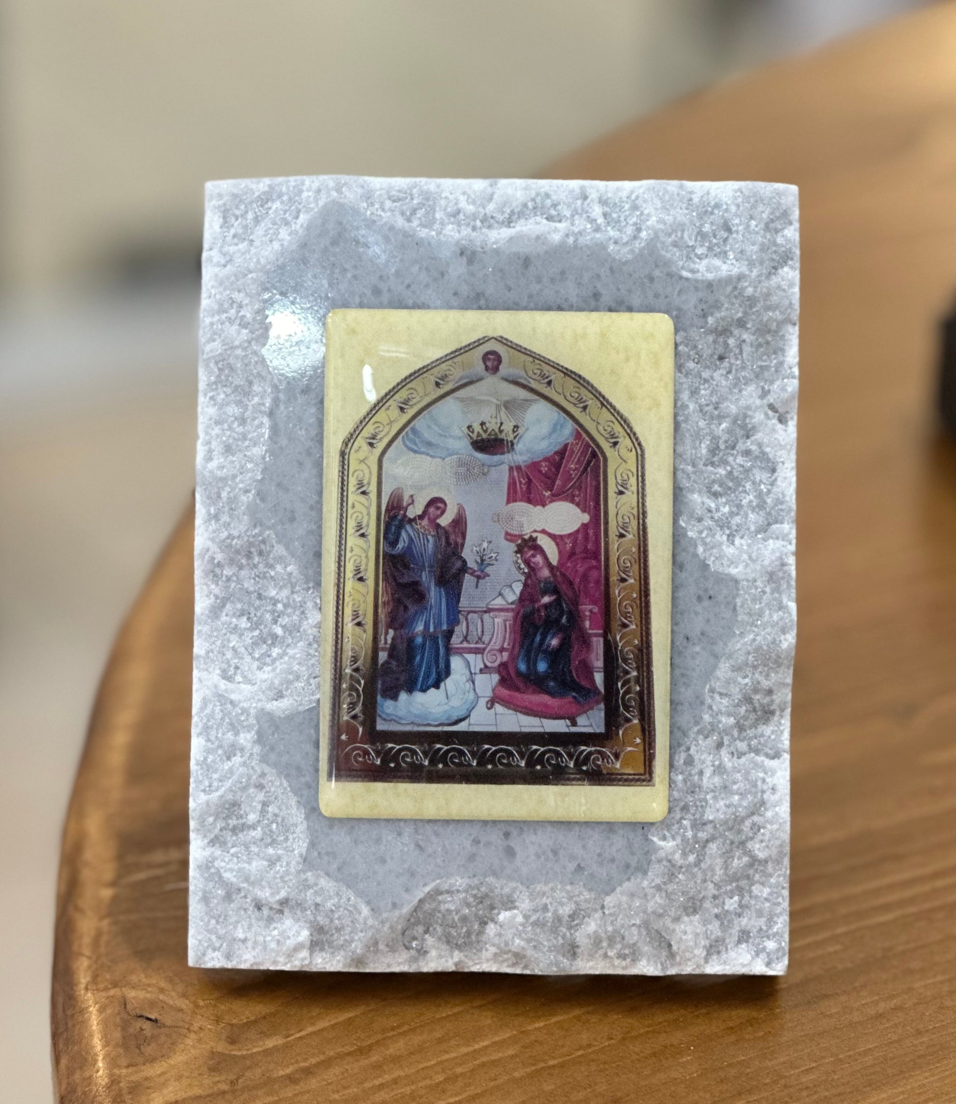 The Virgin Mary of Tinos in enamel on raw marble