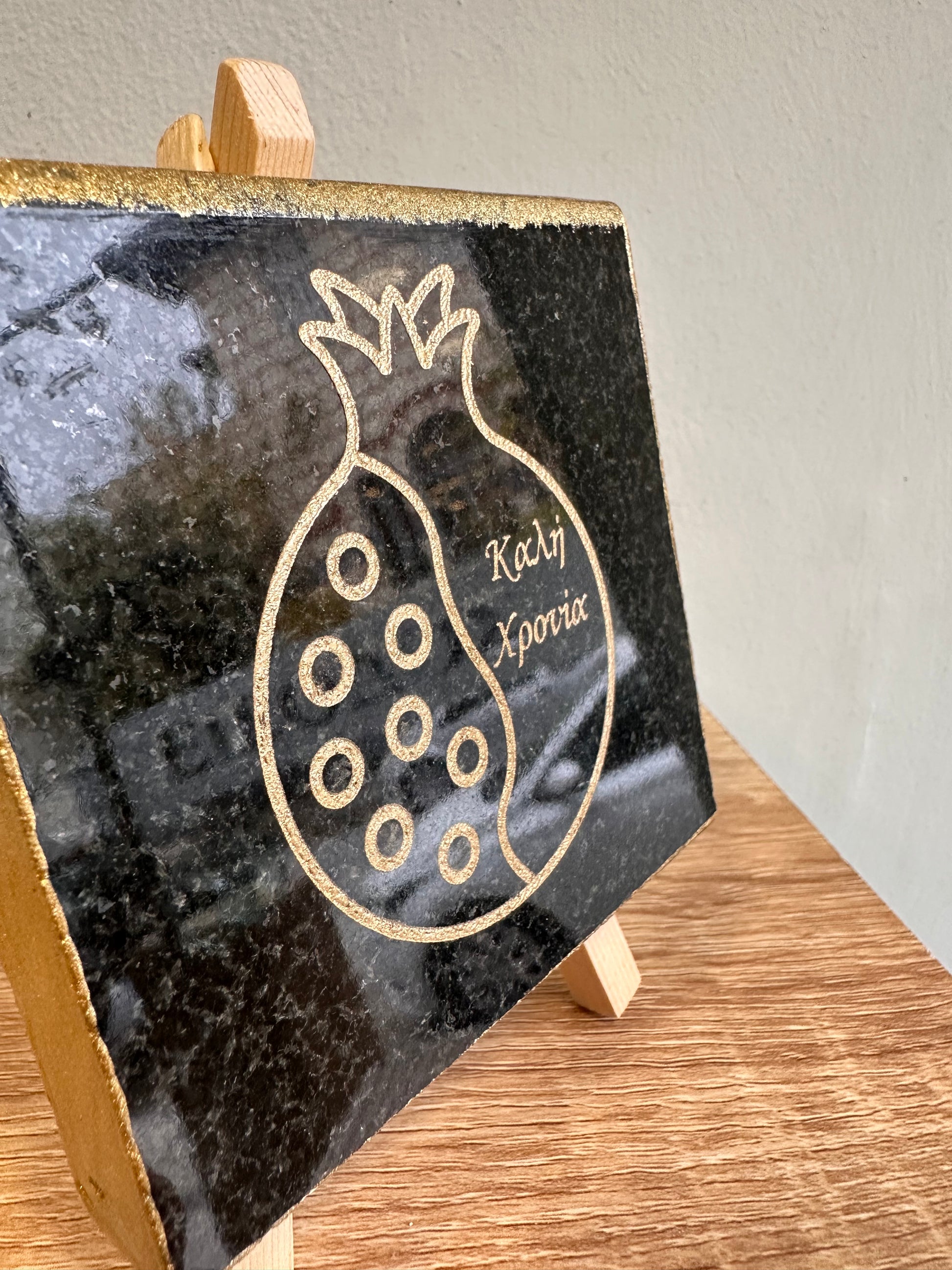 Γούρι ρόδι καλή χρόνια χαραγμένο σε μαύρο γρανίτη με χρυσά γράμματα και ξύλινη βάση