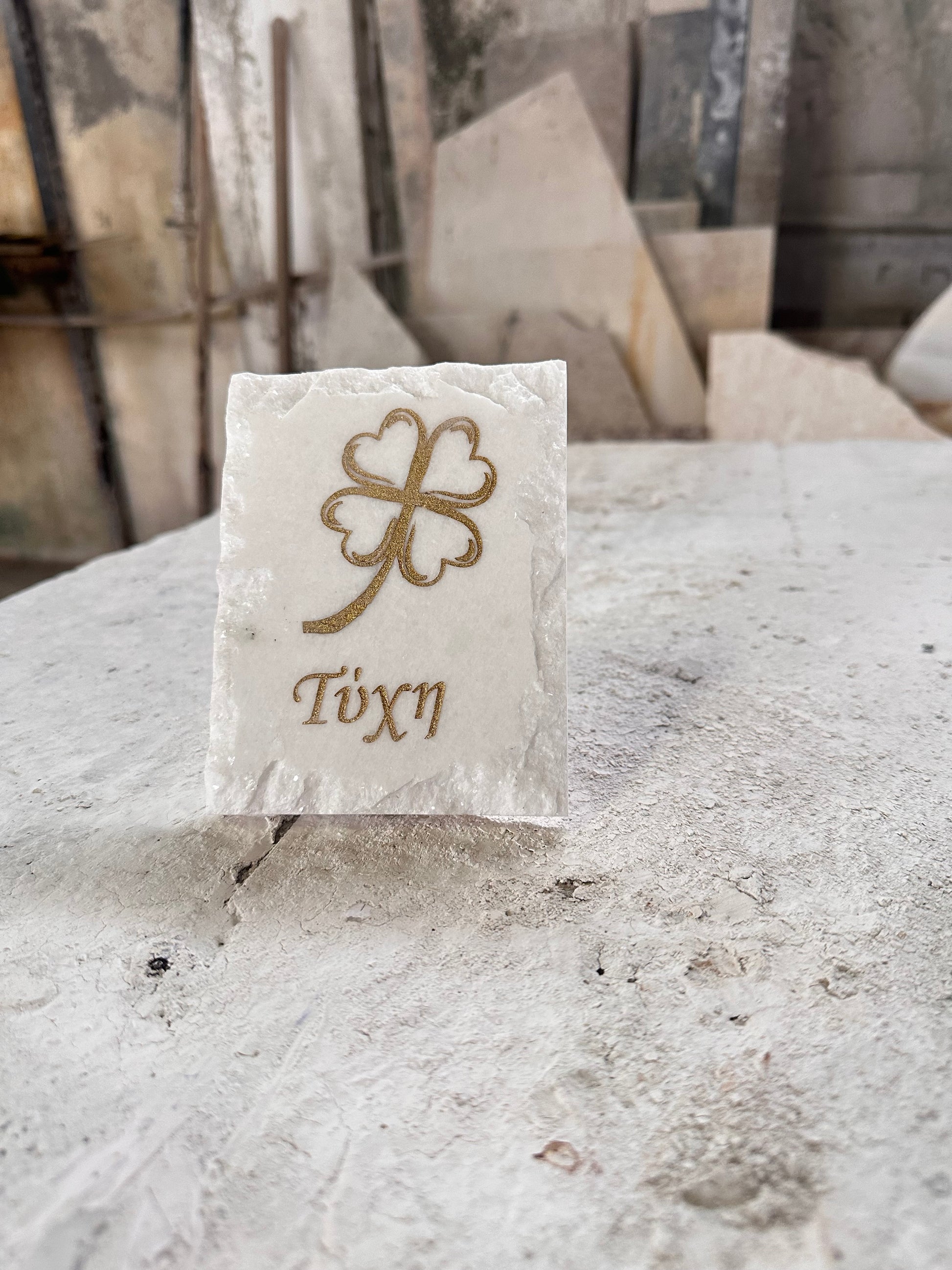 «Τύχη» γούρι με τετράφυλλο τριφύλλι σε λευκό ακατέργαστο μάρμαρο